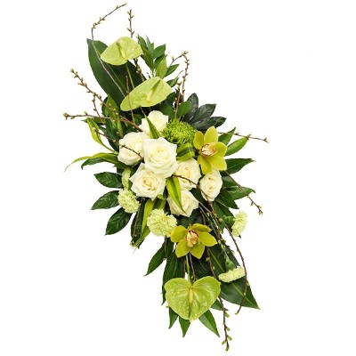 Worte sind nicht genug? Verschicke dieses wunderschöne Gesteck mit einem persönlichen Gruß als Zeichen deiner Anteilnahme. Üblicherweise enthält das Gesteck Blumen wie Rosen, Cymbidium-Orchideen, Flamingoblumen, andere Blumen der Saison und saisonales Grün.